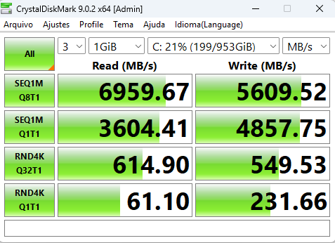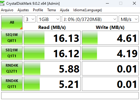 Depois, utilizando o CrystalDiskMark, faça um teste de velocidade do dispositivo com (1) seu pen-drive (de qualquer tamanho) inserido no computador e (2) o SSD do computador. O teste irá resultar em uma medição de leitura e escrita em MB/s que permitirá verificar a velocidade de trabalho que pode ser equiparada com o bitrate de trabalho dos footages, como o exemplo abaixo: